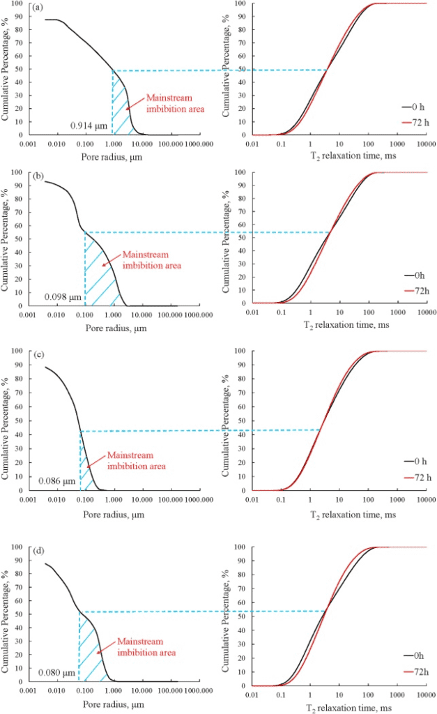 圖6中,左圖和右圖分別來(lái)自PCMI和NMR實(shí)驗(yàn)。在初始和最終T2累積曲線的任何交叉點(diǎn)上,汞入侵都會(huì)發(fā)生飽和。這個(gè)交叉點(diǎn)與孔隙半徑有關(guān),二者連接形成之間的區(qū)域(圖6中藍(lán)色線條區(qū)域)被稱(chēng)作主流浸潤(rùn)區(qū)。隨著主流浸潤(rùn)面積的增加,最終的石油生產(chǎn)效率也會(huì)提高,浸潤(rùn)面積可以被認(rèn)為是致密砂巖中滲吸效率的一個(gè)很好的指標(biāo)。