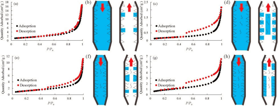這項(xiàng)研究進(jìn)行了自發(fā)滲吸實(shí)驗(yàn),結(jié)合低溫吸附和核磁共振的測(cè)試手段探究了:(1)礦物和孔隙結(jié)構(gòu)如何影響致密砂巖的流體運(yùn)動(dòng)特征;(2)系統(tǒng)地研究不同孔隙類(lèi)型對(duì)石油開(kāi)采的貢獻(xiàn)以及孔隙連接對(duì)自滲吸的影響。