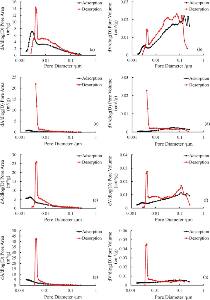 圖3:通過(guò)氮?dú)馕降玫降捻?yè)巖樣品的孔隙面積和孔隙體積分布。X1:a-b,X2:c-d;X3:e-f,X4:g-h