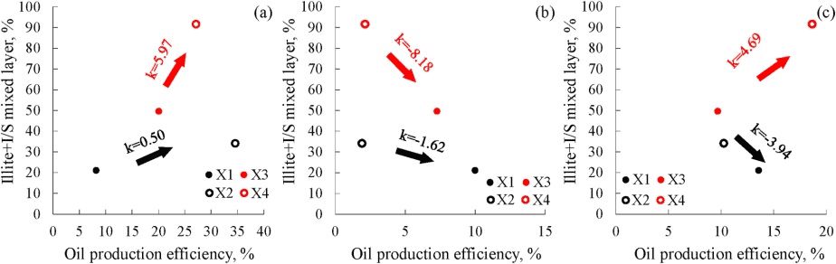 圖4:親水粘土礦物和石油生產(chǎn)效率的擬合(a)早期階段、(b)中期階段和(c)后期階段。k:斜率。