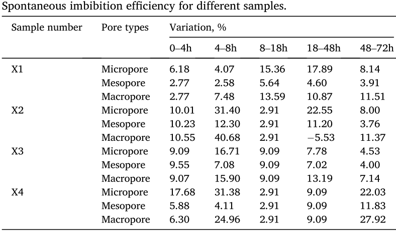滲吸可以分為三個(gè)部分:早期階段、中期階段和后期階段。早期階段(0-8小時(shí))滲吸速度較快速,中期階段(8-18小時(shí))和后期階段(18-72小時(shí))趨于適度,自滲吸一般發(fā)生在早期階段,液態(tài)移位的油量隨時(shí)間明顯減少。