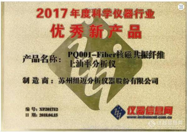核磁共振纖維上油率分析儀榮獲2017年度優秀新品
