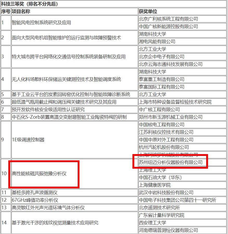 2018年10月11日,中國儀器儀表學會分析儀器分會會員單位蘇州紐邁分析儀器股份有限公司的“高性能核磁弛豫分析儀”榮獲了中國儀器儀表學會科學技術三等獎。