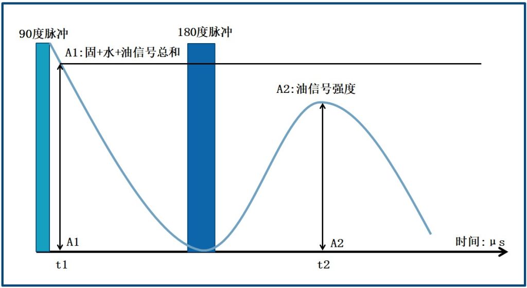 使用自旋回波序列進行測量,圖一是自旋回波序列與檢測到的核磁信號。在90度射頻脈沖后t1處測量了自由感應衰減(FID)NMR信號。此時信號幅度(A1)與樣品的兩個液相(水分和油分)中的H質子數成正比。180度脈沖后,檢測自旋回波信號幅度為A2,此時水的信號已經衰減為0,A2僅為油的信號。