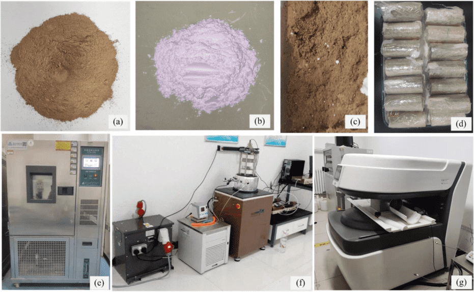 圖1 (a)黃土、(b)納米氧化鎂、(c)NM處理的黃土、(d)測試樣品、(e)凍融室、(f)動態三軸裝置、(g)核磁共振(NMR)分析儀。