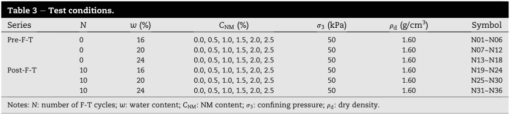 傳統的穩定劑材料(石灰、水泥等)已經變得越來越昂貴,同時占全球碳排放的比例也越來越高。因此采用友好型添加劑取代它們具有重要意義。在低碳穩定材料中,納米氧化鎂(NM)由于其高膠合度和良好的穩定性等特點,是一種新興的低碳和高性能穩定材料。在過去的幾十年里,人們投入了大量的資源來研究NM在彌補土壤靜態特性方面的機制。研究表明,NM可以改善粒子間的粘合性,同時可以填充孔隙,并在強度、可壓縮性等方面帶來明顯的改善。然而,NM在動態特性方面的改進效果仍然相當不清楚,特別是涉及凍融循環這種復雜的外部環境。