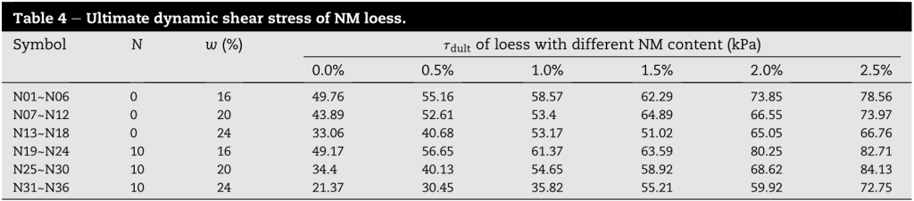 圖3描述了在各種評估條件下的動態剪切應變-模量之間的關系。正如預期的那樣,隨著應變的增加,剪切模量有一個下降的趨勢。先出現緩慢的降低,然后呈現出大幅下降。此外,我們觀察到,動態剪切應變-模量曲線隨著NM的增加而向上移動,而隨著含水量的增加而向下移動,因此含水量對凍融的有害影響被揭示出來,同時證明了納米氧化鎂顆粒對黃土在凍融循環下抗性的提升作用。