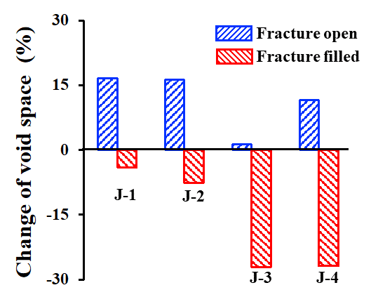 計(jì)算裂縫填充前后的孔隙變化率(圖4),PVF(藍(lán)色)反映壓裂對(duì)總孔隙的改善效果,PVG(紅色)反映基質(zhì)孔隙轉(zhuǎn)化為裂縫的量。壓裂對(duì)微孔發(fā)育巖樣(J-1和J-2)孔隙體積的改善效果更明顯,但基質(zhì)孔轉(zhuǎn)化為裂縫的比例低。宏孔發(fā)育巖樣(J-3和J-4)結(jié)論相反,總孔隙體積的改善效果一般,但基質(zhì)孔轉(zhuǎn)化為裂縫的比例高。其中,PVF通過比較M0和F0累積核磁信號(hào)量得到,PVG通過比較M0和G0累積核磁信號(hào)量得到。