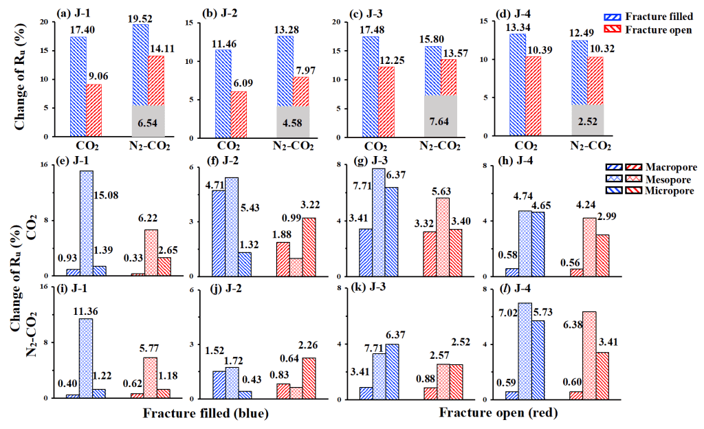以壓裂前M0采收率為基值,對(duì)比裂縫和氣體組合下的增采量Ru(圖6)。基質(zhì)巖樣M0注N2-CO2效果要好于純CO2(灰色,Dong,2020a)。相比于純CO2吞吐模式,壓裂樣品注N2-CO2在微孔發(fā)育巖樣(J-1和J-2)中效果好,但在宏孔發(fā)育樣品中效果差(J-3和J-4),推測(cè)與N2分子對(duì)小孔的彈性支撐作用有關(guān)。裂縫會(huì)存儲(chǔ)大量氣體,尤其是CO2,削弱氣體在基質(zhì)孔隙的擴(kuò)散動(dòng)能,使得總采出量下降(紅色)。裂縫填充處理可以增大氣體在基質(zhì)孔隙中的波及效率,增大采收率(藍(lán)色)。短期來看,造裂會(huì)大幅度提高產(chǎn)量;但縫的儲(chǔ)氣性對(duì)長期開發(fā)會(huì)產(chǎn)生不利影響。
