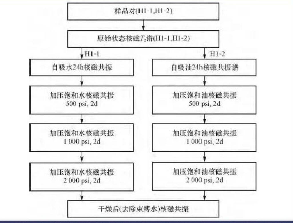 為識(shí)別有機(jī)孔與無(wú)機(jī)孔T2譜峰位置,將同一深度點(diǎn)的柱樣分成兩部分,分別在飽和鹽水和油(正十二烷)條件下進(jìn)行T2譜測(cè)量,具體步驟如下圖所示。