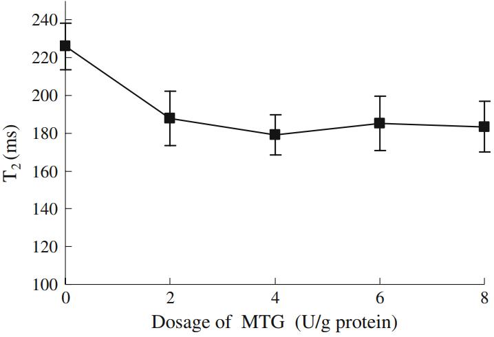 低場核磁共振數據顯示,加酶的樣品T2弛豫時間變短,表明由于網絡的形成,蛋白質質子的流動性較小。
