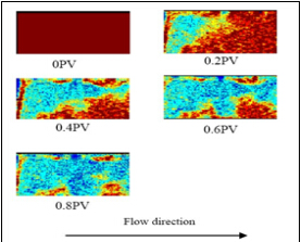 紅色代表油的信號,綠色代表水的信號。0PV代表飽和油,然后進行水驅,從左至右,中間部分首先被驅替,端面仍殘留一些油。通過成像觀察,可以看到優勢通道和端面效應。
