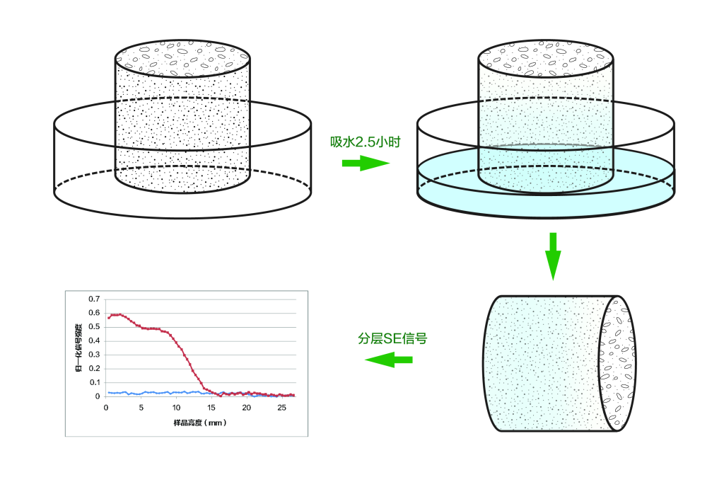 對于動態樣品,需要快速測大孔孔隙里面的分層含水率和水分分布狀態,可以通過空間編碼技術實現,測得不同位置的含水率變化,通過觀察樣品吸水過程中的水分遷移,實現水分遷移動態研究,分析其滲透吸水性能。