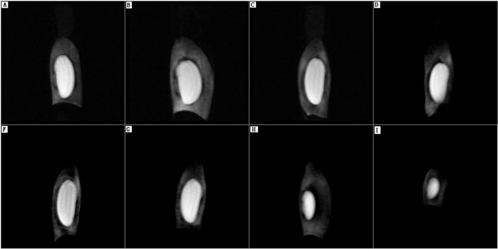 T1加權像在氫質子密度像的基礎上,增加 T1 的影響效果。由于豆莢內油的T1小于水,且T1加權像中,T1 越短對應信號強度越強,亮度越高,所以 T1 加權像可以突出油信號。對應于下方圖像,在豆莢和種子的種皮區域含油率極低,含水率高,在圖像中表現為弱信號(由于含有水分子,依然貢獻氫質子,所以在圖像中依然有表現)。種子內部亮度不均勻,在質子密度分布均勻的情況下,亮度越高,說明此部分 T1 值越短,含油率越高。通過 T1 加權像能夠初步觀察油的空間分布情況。