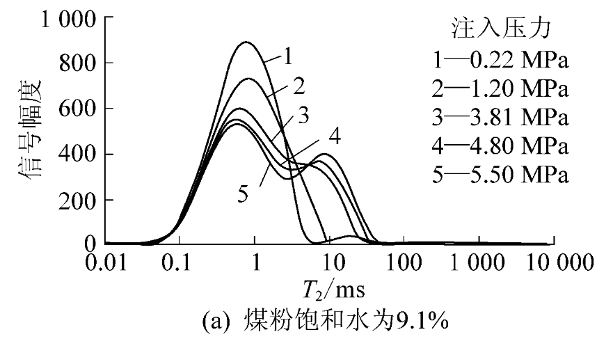 分析上圖可知,當(dāng)飽和水煤粉浸沒在不同壓力的CO2中時(shí),煤粉的核磁共振T2譜圖由初始飽和水的單峰結(jié)構(gòu)變?yōu)槊黠@的雙峰結(jié)構(gòu)。隨著CO2氣體壓力增大,吸附水峰面積減小,同時(shí)形成一個(gè)新的毛管束縛水峰,并逐漸向右偏移,即煤中吸附水轉(zhuǎn)變?yōu)槊苁`水。當(dāng)煤粉含水量增高,吸附水達(dá)到飽和的極限,多余的水則停留在毛管孔隙成為毛管束縛水。