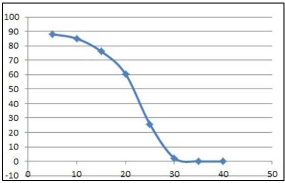由于來自固體的NMR信號衰減比來自液體的NMR信號衰減快得多。因此,可以在FID(圖1)上的兩個點進行測量,分別在“t1=11us”點進行測量,該點對應固體和液體信號的總和A1。在另一個點“t2=70us”進行測量,該點固體信號已經衰減到0,測試到的信號A2僅為液體信號。通過計算,即可得到樣品在對應溫度下的固體脂肪含量。對多個溫度進行測試,即可得到溫度與固體脂肪的變化曲線。