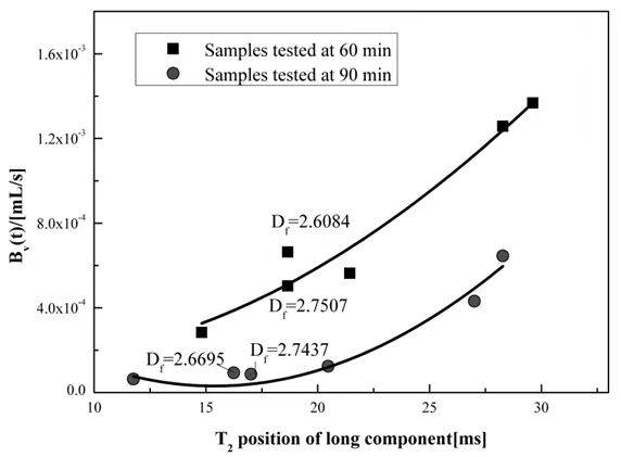 樣品橫向弛豫時間接近,較低分形維數的水泥漿體具有較大泌水速率以及較大初始流動度。