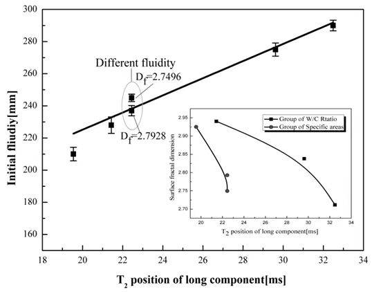 利用LF-NNR技術探究水泥漿體初始結構及相關機理的研究。結果表明:利用核磁共振技術研究水泥漿體初始結構有一定的優(yōu)勢。橫向弛豫時間不同范圍的信號可反映水泥漿體內部絮凝結構、孔隙水、過渡層水以及泌出自由水的變化情況。本研究基于分形理論,利用低場核磁共振技術對初始孔隙結構進行了表征,發(fā)現初始孔隙結構存在分性特征,并分析得出分形維數隨水灰比的提高而降低,且在橫向弛豫時間接近時,具有較低分形維數的水泥漿體會引起較高的泌水速率以及較大的初始流動度