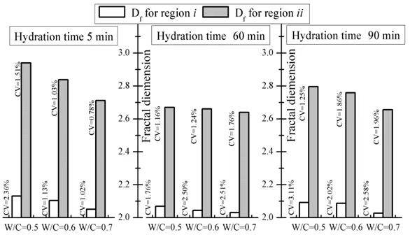 分形維數可較為客觀的刻畫水泥漿體內部孔隙結構的復雜程度。由圖 3顯示分形維數隨著水灰比的升高而降低,且由于泌水及沉降作用,水化時間60 min的分形維數比5 min的水泥漿體分形維數低,且隨著水化時間的延長(至90 min),分形維數逐步提升。通過與水泥漿體宏觀試驗結果發(fā)現,水泥漿體的加權T2與泌水速率與流動度均存在顯著的線性相關性,且當T2接近時,較低分形維數的水泥漿體具有較大泌水速率以及較大初始流動度。