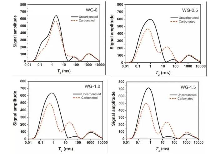 為闡述PC和AAS砂漿碳化前后的微觀孔隙結(jié)構(gòu)變化,采用紐邁分析的MacroMR12-150H-I低場核磁共振分析系統(tǒng),對碳化前后的40×40×40mm砂漿樣品進(jìn)行了核磁共振測試。首先,將樣品置于60°C的烘箱中24 h。然后冷卻至室溫(20°C),使用真空飽和裝置使砂漿樣品飽和。