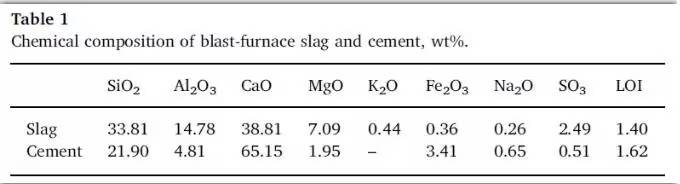 試驗(yàn)主要選用某鋼鐵公司所產(chǎn)的玻璃質(zhì)磨粒高爐礦渣和P.I 42.5硅酸鹽水泥。采用X-ray技術(shù)X射線熒光來測定礦渣和水泥的主要化學(xué)成分,具體可見下表。