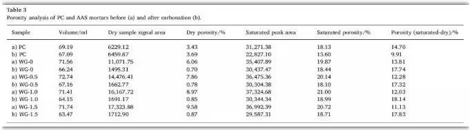 可以看出,在碳化前后,PC和AAS的體積、干樣品信號和孔隙率存在較大差異。結(jié)果表明,碳化過程對所有試樣的收縮效應(yīng),但PC試樣的收縮率較低。這主要與Ca(OH)2膨脹轉(zhuǎn)化為CaCO3有關(guān),有研究表明,碳酸鈣的形成使體積增加了11.8%。另一方面,當(dāng)采用0、0.5、1、1.5三種模量時(shí),水玻璃模量的增加使收縮率分別提高了7.43%、7.67%、9.98%和11.53%。這可能是由于隨著水玻璃模數(shù)的增加,C-S-H的形成阻礙了碳酸鈣的結(jié)晶。此外,碳化過程中水滑石的形成也可能對碳酸鈣結(jié)晶產(chǎn)生干擾作用。
