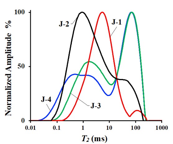 圖2.壓裂前樣品飽和輕油T2譜(J-1和J-2取自吉木薩爾凹陷,J-3和J-4取自西湖凹陷)