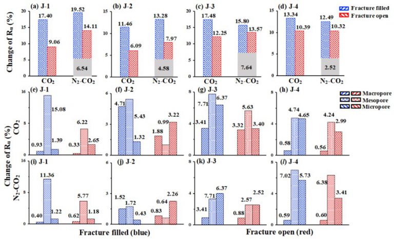 以壓裂前M0采收率為基值,對比裂縫和氣體組合下的增采量Ru(圖6)。基質巖樣M0注N2-CO2效果要好于純CO2(灰色,Dong,2020a)。相比于純CO2吞吐模式,壓裂樣品注N2-CO2在微孔發育巖樣(J-1和J-2)中效果好,但在宏孔發育樣品中效果差(J-3和J-4),推測與N2分子對小孔的彈性支撐作用有關。裂縫會存儲大量氣體,尤其是CO2,削弱氣體在基質孔隙的擴散動能,使得總采出量下降(紅色)。裂縫填充處理可以增大氣體在基質孔隙中的波及效率,增大采收率(藍色)。短期來看,造裂會大幅度提高產量;但縫的儲氣性對長期開發會產生不利影響。