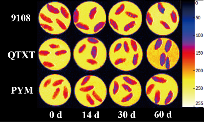 2、水分狀態分析: 使用低場核磁共振(LF-NMR)技術檢測不同凍藏時間點樣品的水分弛豫特性,計算不同狀態水分的比例(特別是自由水含量T22的變化),并通過MRI觀察水分空間分布的均勻性。