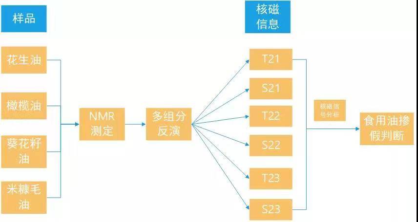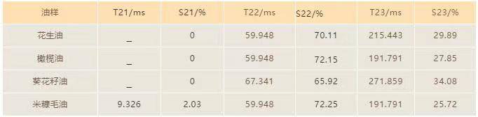 2、研究還發現,其它不合格油脂如其它種類毛油、煎炸油、酸敗油的弛豫圖譜均能在10ms左右出現特征小峰T21,因此本實驗方法可以進一步應用到其它油脂摻假研究中,作為食用油摻假的初步判定。