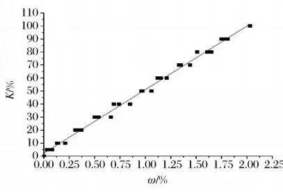 植物油摻米糠毛油曲線的回歸方程為 : K/ % =48 .792 ω+2 .2831 K,摻偽量,%;