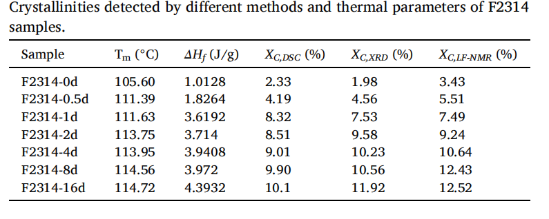 表1:通過不同方法檢測到的 F2314 樣品的結(jié)晶度及熱學(xué)參數(shù)。
