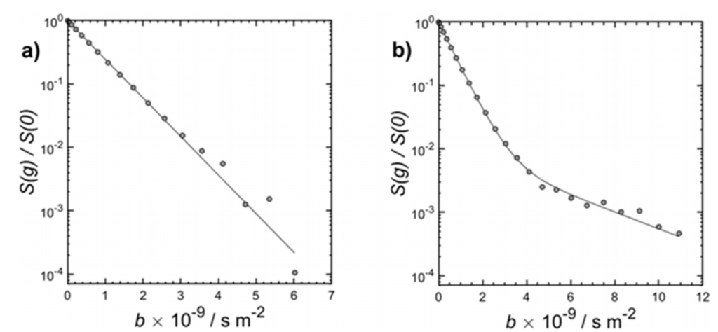 圖2:PGSTE序列測試數(shù)據(jù)a、未經(jīng)處理的H-Y分子篩(單指數(shù)衰減函數(shù)擬合);b、經(jīng)硝酸洗脫后的H-Y分子篩(DA(HNO3 0.5 h)-Y)(雙指數(shù)衰減函數(shù)擬合)