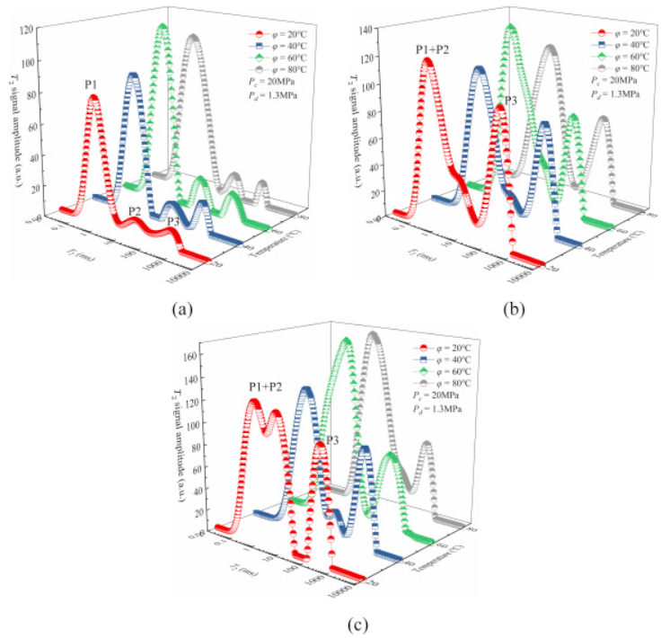 最初,不同溫度下砂巖弛豫分布呈三峰分布(圖三(a))。然后,隨著注漿的繼續(xù),T2分布逐漸變化(圖三(b)和(c))。隨著注入時間從t=30s增加到60s,第二峰幾乎與第一峰合并,T2弛豫分布從三峰分布轉(zhuǎn)換為雙峰分布(圖三(b)),其中新的第一峰(P1+P2)和第二峰(P3)分別分布在0.1ms–100ms和100ms–1000ms的范圍內(nèi)。此外,隨著注入時間的增加,不同溫度下新的第一峰(P1+P2)和第二峰(P3)均增大,意味著漿體同時滲透到微孔、大孔和裂縫中。此外,隨著溫度從20℃升高到80 ℃,t= 30s處新的第二峰(P3)面積減小,這代表了溫度升高對裂縫中漿體的流動有明顯阻礙作用。如圖三(c)所示,隨著進樣時間從t=30s增加到60s,新的第二峰(P3)變化不大,而新的第一峰(P1+P2)的面積和峰值明顯增加。這意味著此時的滲流過程主要發(fā)生在巖石孔隙中,漿體從裂縫滲透到微孔隙中。