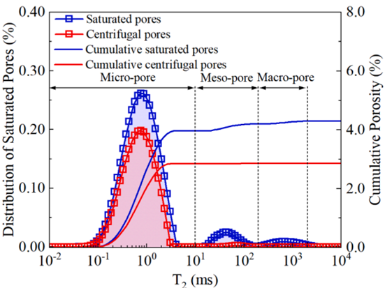 該研究使用低場核磁共振技術(shù),研究了脈沖加載水力壓裂后損傷煤樣的孔隙結(jié)構(gòu),獲取弛豫譜圖和孔隙度分布信息,有以下結(jié)論:圖二表明煤的孔隙度分布隨T2的變化而變化。根據(jù)飽和孔隙的累積曲線,微孔的孔隙率約為3.96%,總孔隙率為4.30%。煤樣的峰值飽和孔隙度位于T2=0.76ms處。飽和孔隙率包括被游離水和吸附水占據(jù)的孔隙。通常可用通過離心法去除游離水來測量吸附的孔隙率。飽和孔隙和離心孔隙的覆蓋面積之差代表自由孔隙。從累積孔隙率曲線可以看出,吸附孔隙的孔隙率為2.86%,自由孔隙的孔隙率為1.44%。