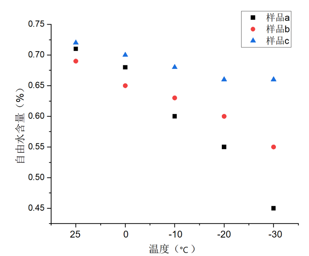 自由水的比例變化決定了水凝膠的抗凍性能,不同溫度下自由水比例變化越小,水凝膠越抗凍。從圖表中可以看出,隨著溫度的降低,樣品c中的自由水含量變化是最小的,也證明了樣品c的抗凍能力較a、b來說更強。