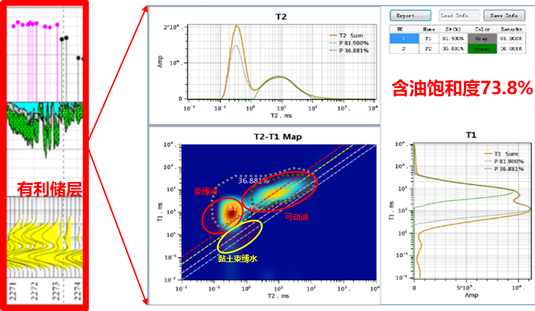 以上為油田現(xiàn)場頁巖油儲層的一口預(yù)生產(chǎn)井,通過井場全直徑核磁實驗分析,確定了有利儲層段:一維核磁確定雙峰T2譜為有利儲層,大孔隙發(fā)育良好,孔隙度為7.51%,二維核磁確定的含油飽和度為73.8%。該數(shù)據(jù)為油井開發(fā)提供了及時可信的巖石物理實驗依據(jù)。