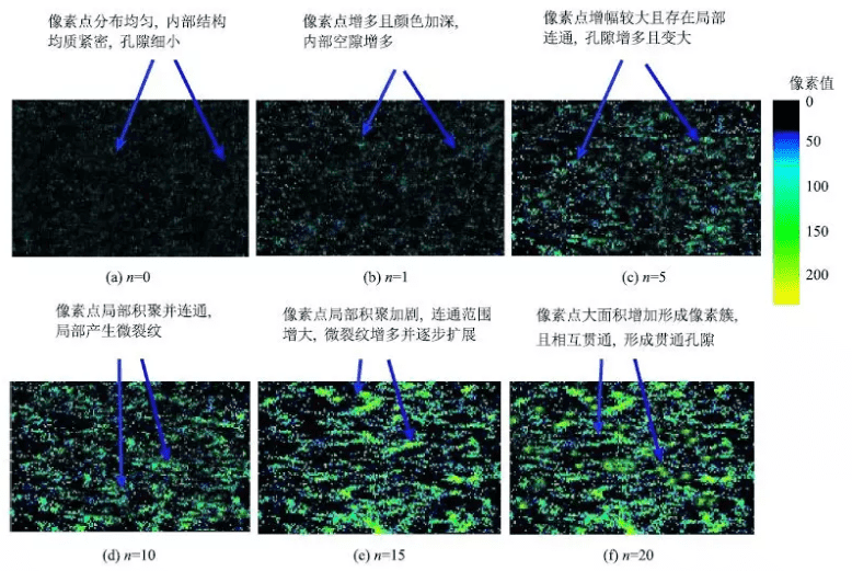 從圖中可以看出,隨著干濕循環實驗的進行,巖石內部孔隙逐漸增多,孔隙尺寸增大,形成貫通的小裂縫并逐漸擴展,不同循環次數作用后的MRI內部結構變化與SEM微觀結構變化相似(圖5)。