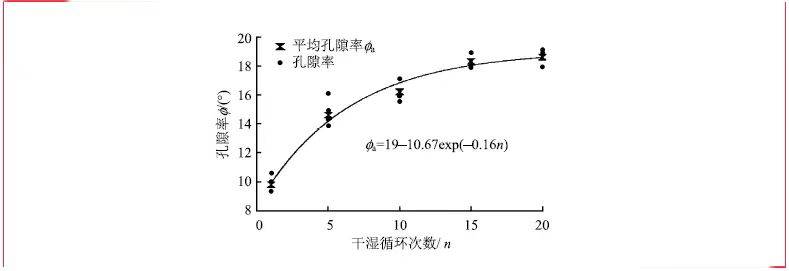 由于T2譜圖的總面積代表巖石內部的總孔隙體積,而譜面積的大小與巖石中所含流體的多少成正比,即與巖石中孔隙率的大小相關。通過求取平均的譜面積與循環次數的變化規律,即可求得孔隙率與干濕循環次數之間的相關關系(圖3),從圖中可以看出,孔隙率與干濕循環次數呈現出定量的指數關系。