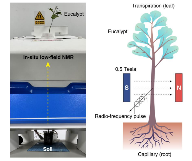 在高大樹木中,水分的上升是一種復雜的現象,受多種因素影響,包括木質部導管復雜的分層結構、木質部導管內的負壓的變化以及水分子與木質部導管壁之間的相互作用。這里提到的復雜性超出了內聚-張力理論的解釋能力。為了準確理解木質部導管內水分的動態行為,該文獻利用低場核磁設備原位追蹤活樹中的水的運輸過程。
