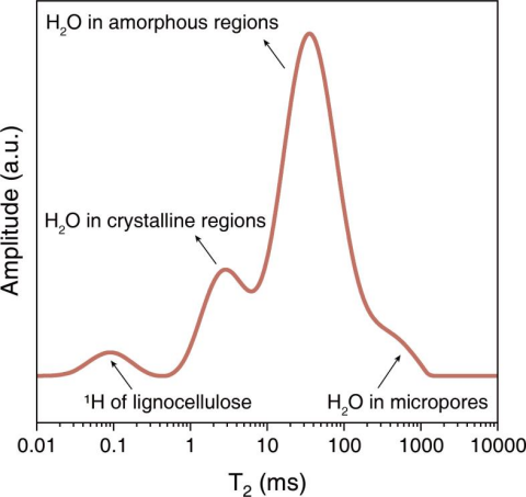 0.09 ms的超短T2時間歸屬于木質纖維素的質子弛豫。兩個較短的T2時間(2 ms和40 ms)分別歸因于納米級狹縫內的水,它們分別與纖維素的晶體區和非晶區相關。長T2時間(600 ms)歸屬于微米級木質部導管內的水。上述結果通過孔徑分布分析進一步得到證實。非晶區水的T2振幅遠高于其他區域,表明水主要集中在木質部導管壁內纖維的非晶區。同時,木質部導管僅含極少量的水,表明這些導管內存在大量的空洞。