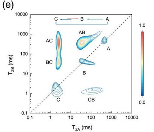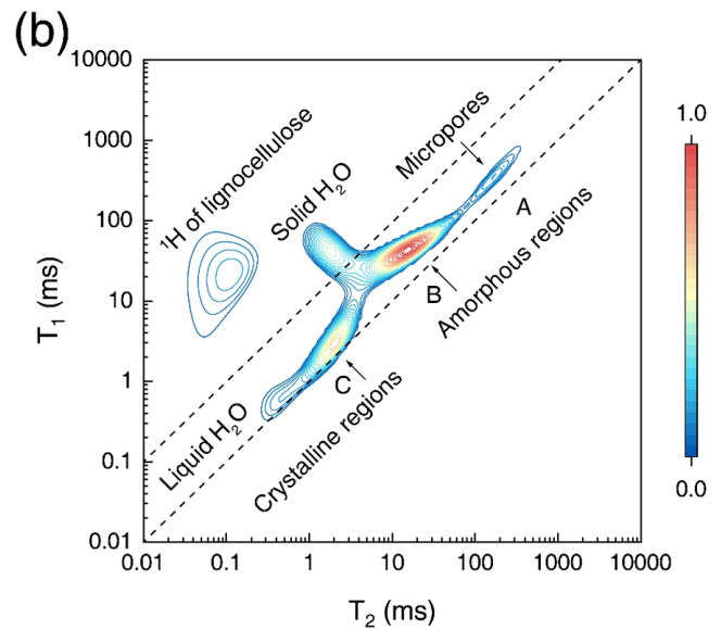 如圖 4 所示,(T2 = 0.1,T1 = 24)的自旋布居被分配給活桉樹的木質纖維素中的質子。對角線附近的自旋布居被分配給活桉樹內的水。更具體地說,(1.7,2.3)和(1.9,49.6)的自旋布居被分配給結晶區域的水,(16.6,42.5)被分配給非晶態區域的水,(168.1,391.7)被分配給木質部導管中的水。特別地,結晶區域中水的自旋布居呈現出兩種不同的形狀,一個平行于對角線的紡錘體和另一個垂直于對角線的紡錘體。