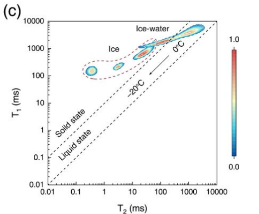 從遷移率的角度來看,當T1/T2 = 10時(圖 5),固體和液體之間的分界線出現。結晶區域中垂直于對角線的自旋布居的T1/T2比值為26。這表明一些水被困在螺旋纖維結晶區域的半無序表面。這種嵌入半無序表面的固態水表現出類似于冰的特性。