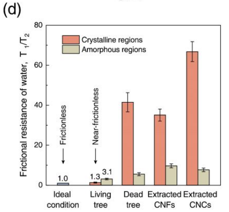 活桉樹、死桉樹、纖維素納米纖維(CNFs)和纖維素納米晶體(CNCs)中晶態和非晶態區域內水的摩擦阻力比較