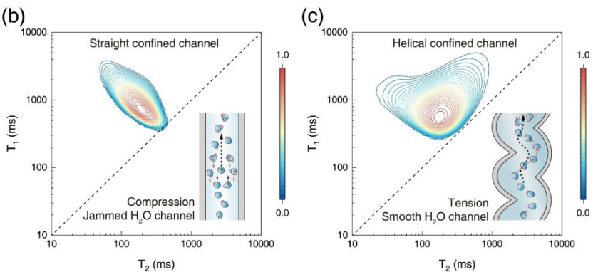 對齊取向的 CNF 微管中水的T1-T2譜圖顯示出垂直于對角線的紡錘形圖案,表明水分子在向上運動過程中受到顯著斥力(圖 8)。相比之下,螺旋狀CNF微管中顯示出與對角線平行的紡錘形圖案,表明水分子向上運動順暢。結果表明,當 CNF在微管內呈螺旋排列時,水所受張力小于垂直排列時的情況。此外,水在螺旋納米纖維之間的縫隙中水平積聚,形成了一個新的“基準面”,抵消了作用在水上的部分重力,從而降低了水分上升過程中的能量消耗。