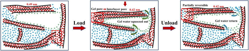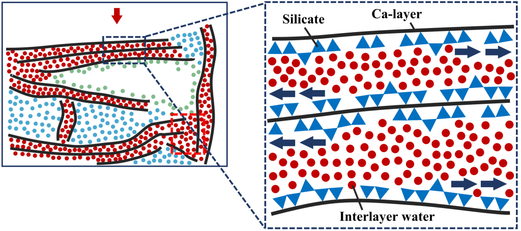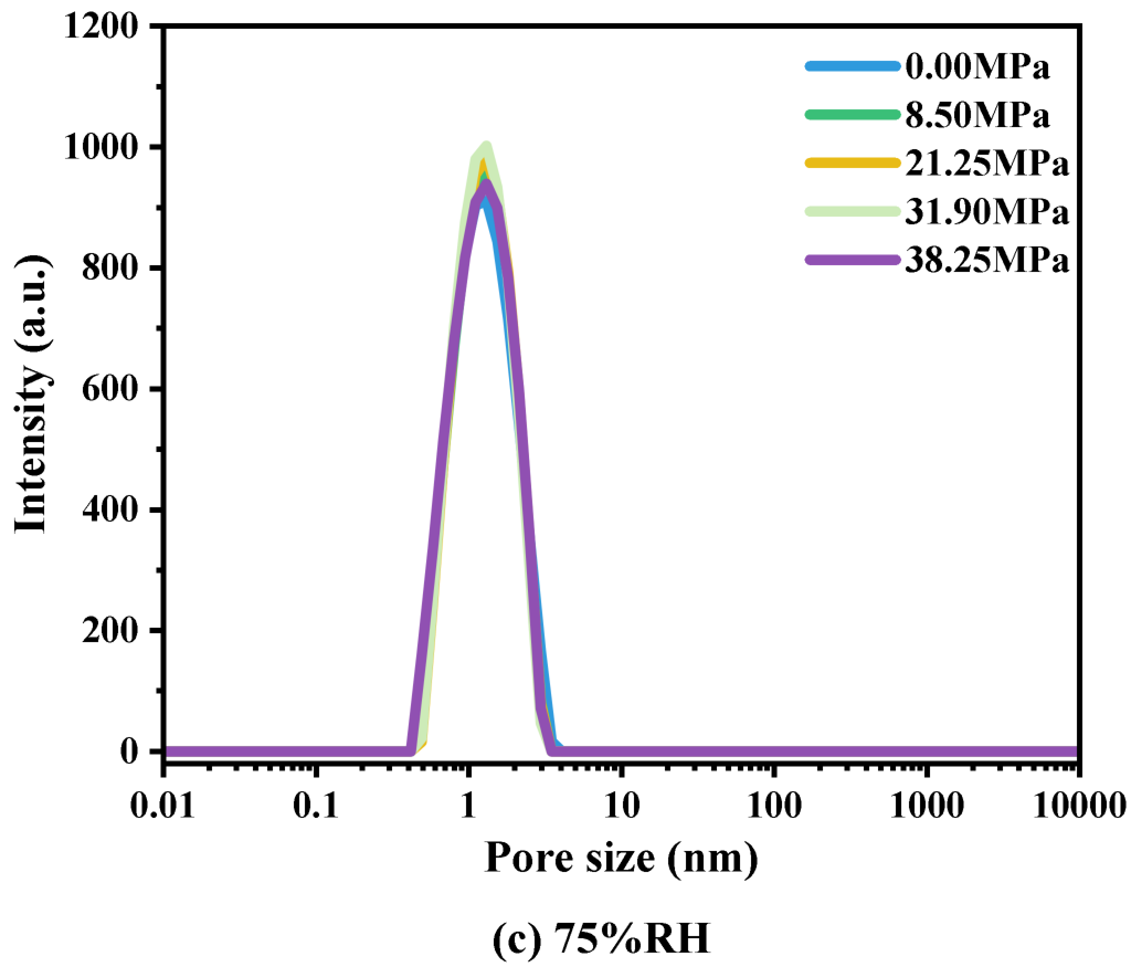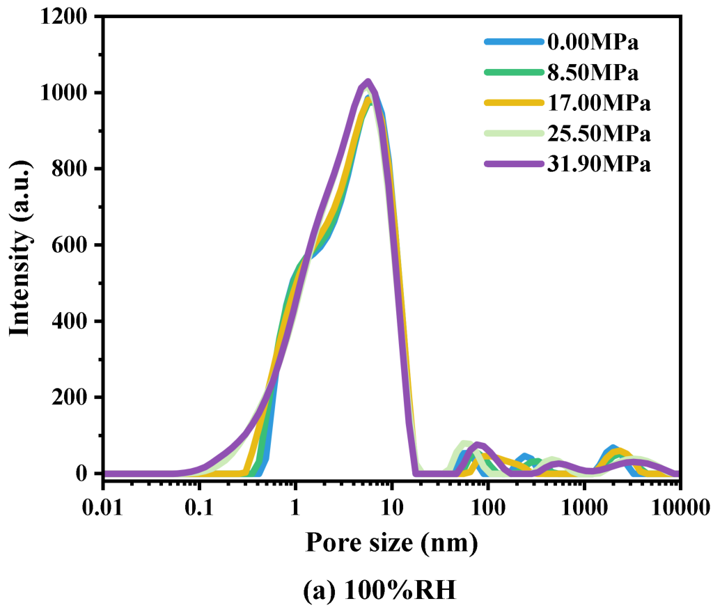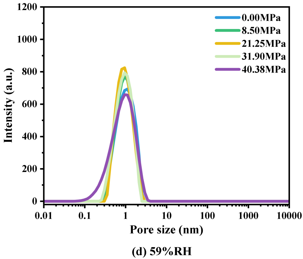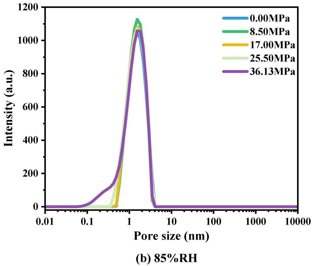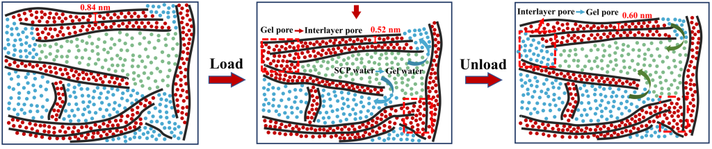 (3)壓荷載作用導(dǎo)致C-S-H層間距減小,部分凝膠孔向?qū)娱g孔轉(zhuǎn)變,同時(shí),層間孔孔徑減小。卸載時(shí),受壓的層間孔被釋放,C-S-H層間距恢復(fù),層間水重新轉(zhuǎn)變?yōu)槟z水。這證明了微觀結(jié)構(gòu)變化與水分遷移的密切聯(lián)系。