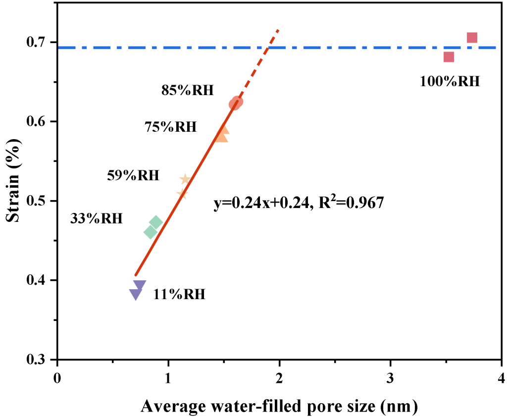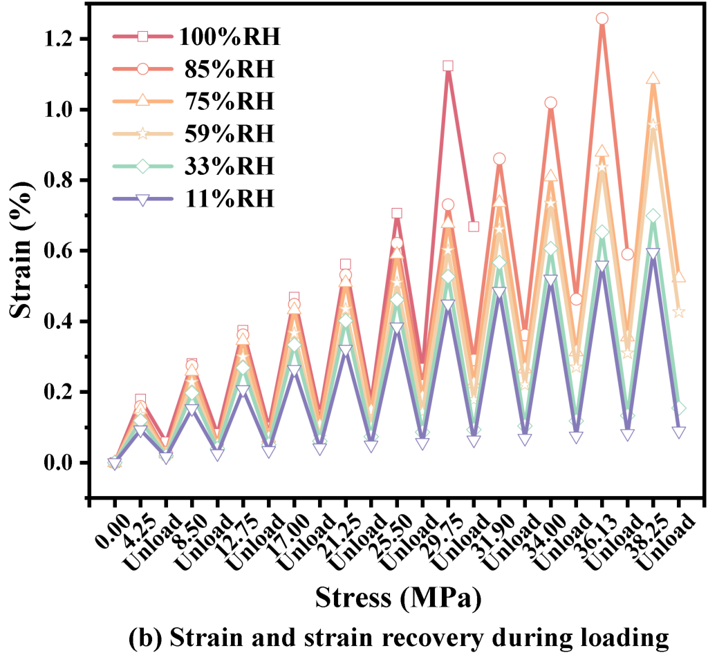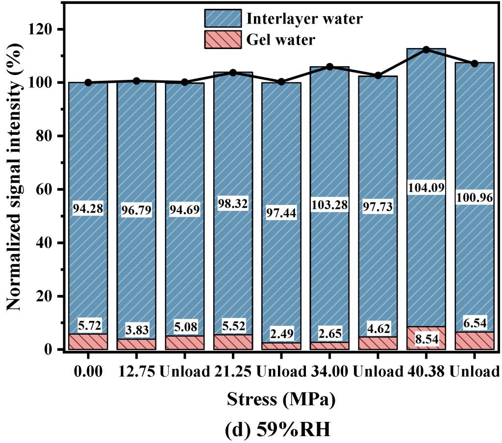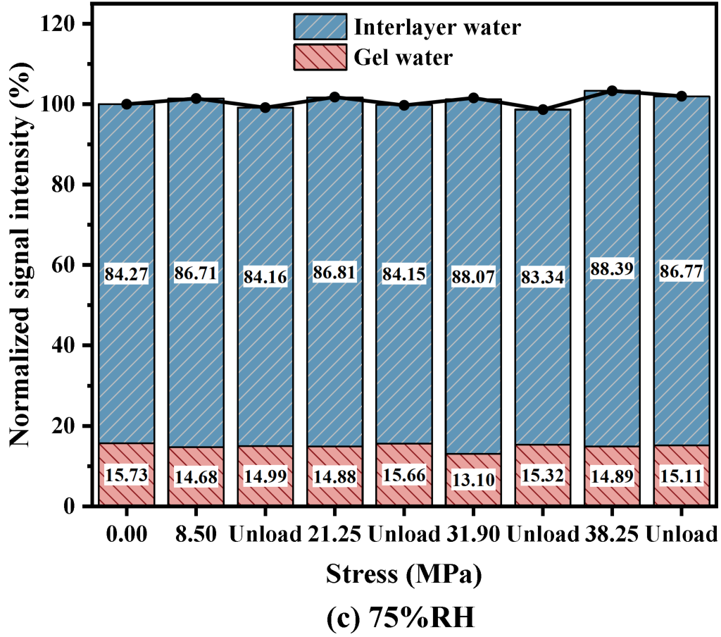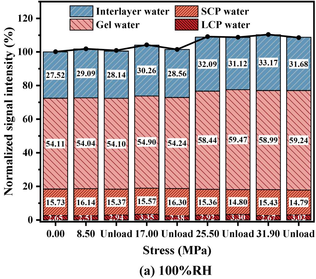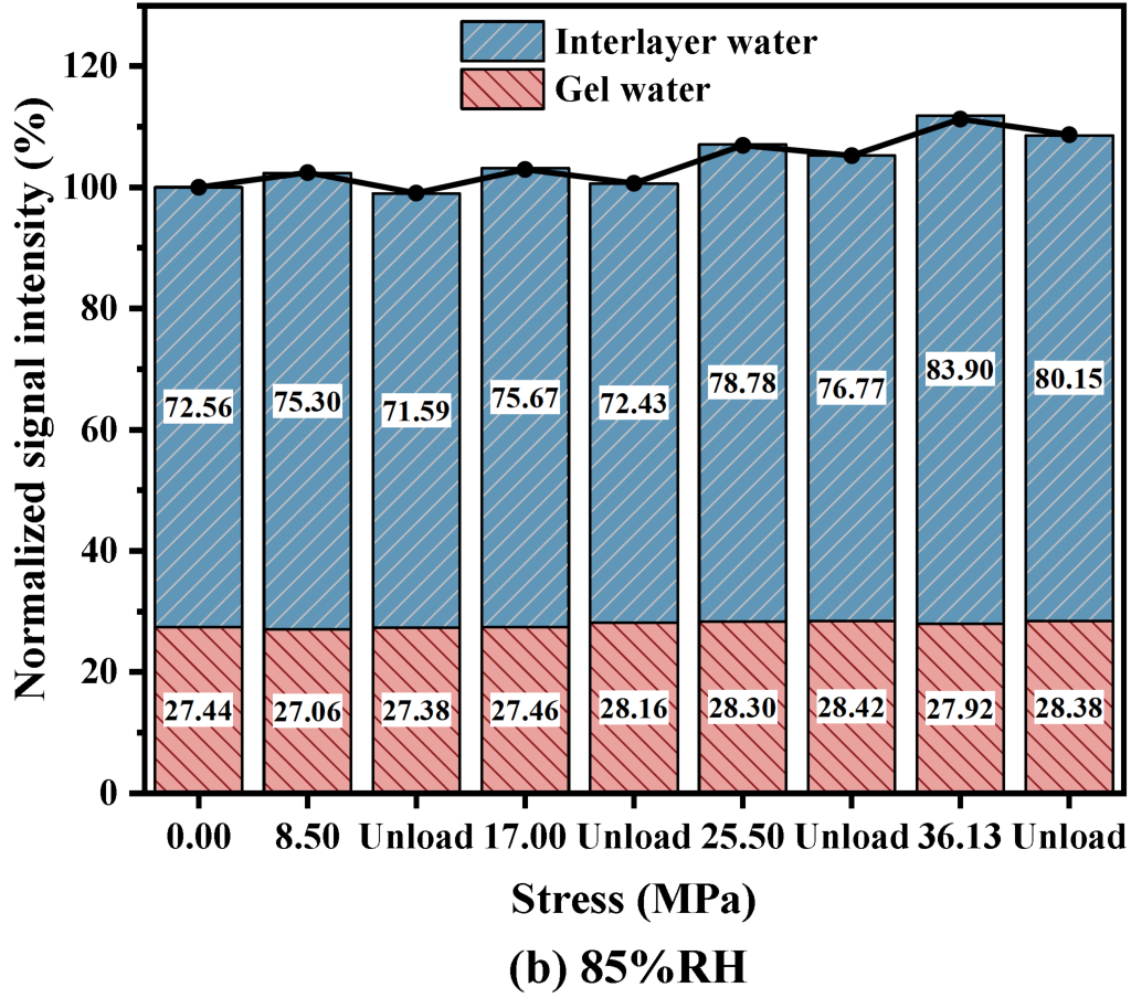 混凝土結(jié)構(gòu)在服役過(guò)程中常常受到力與環(huán)境因素的顯著影響,軸向壓力與環(huán)境濕度是最常見(jiàn)的兩個(gè)因素。不同含水量硬化水泥漿體(HCP)在軸向壓力作用下的水遷移行為仍知之甚少。本研究引入了一種新型軸向壓力控制氫核磁共振(1H NMR)系統(tǒng),對(duì)不同含水量HCP在不同應(yīng)力水平加載過(guò)程中的應(yīng)變變化和水分布進(jìn)行了原位監(jiān)測(cè)。結(jié)果表明,含水量的降低會(huì)減小C-S-H層間距,從而增加C-S-H凝膠的致密化程度,提高水泥基材料的力學(xué)性能。C-S-H層滑移的臨界點(diǎn)為平均層間距等于1.89 nm。在軸向壓荷載作用下,C-S-H凝膠被壓縮,導(dǎo)致部分凝膠孔隙重排為層間孔。因此,層間水含量增加,凝膠水含量減少。隨著應(yīng)力水平的增加,層間含水量逐漸增加。當(dāng)應(yīng)力水平等于或超過(guò)臨界應(yīng)力時(shí)達(dá)到最大值,此時(shí)水分遷移行為從完全可逆轉(zhuǎn)變?yōu)椴糠挚赡妗_@些發(fā)現(xiàn)為HCP在機(jī)械荷載與水分遷移的耦合作用提供了寶貴的見(jiàn)解,對(duì)于預(yù)測(cè)混凝土結(jié)構(gòu)在各種環(huán)境條件下的長(zhǎng)期性能和耐久性至關(guān)重要。