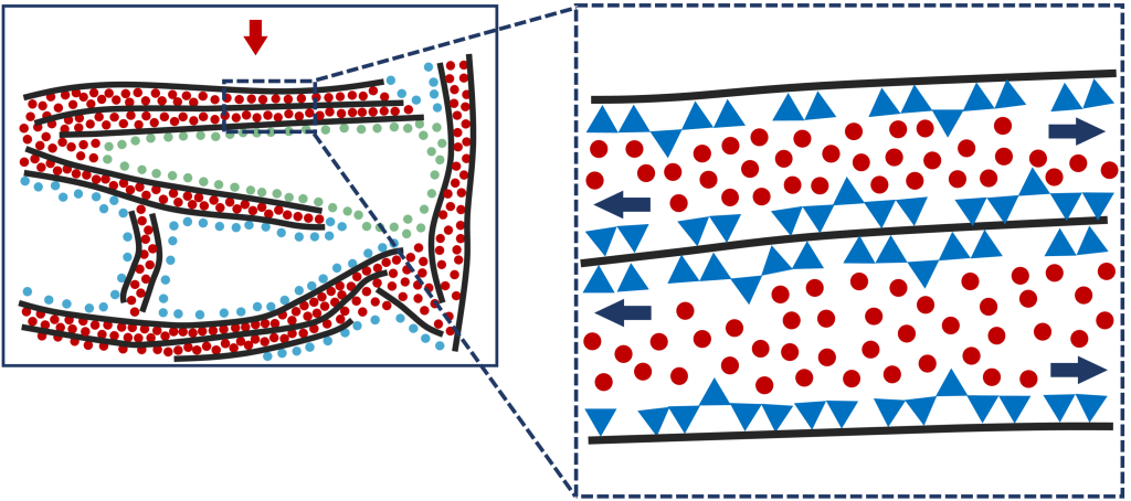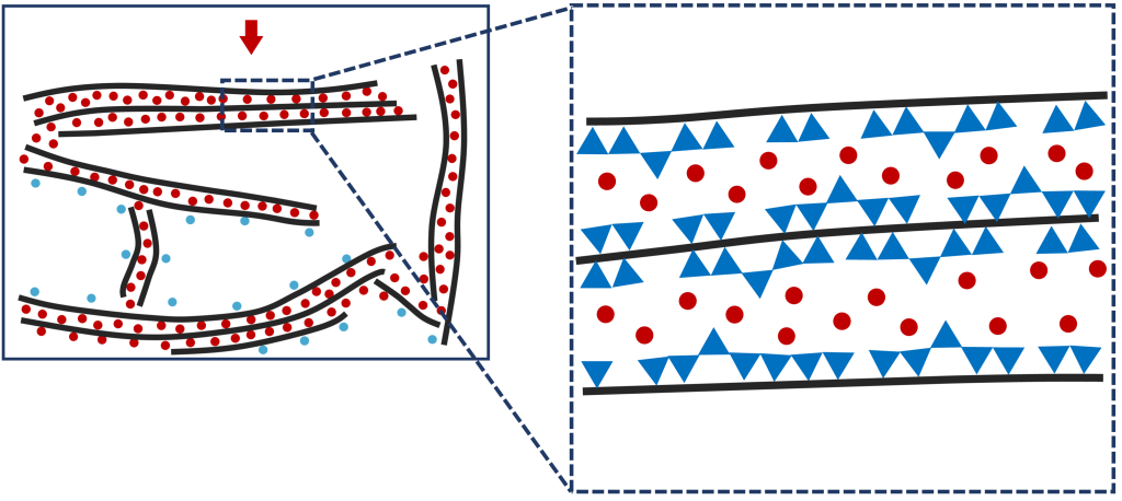 完全飽水HCP的初始微觀結(jié)構(gòu)如圖9(a)左圖所示。荷載作用下凝膠水向?qū)娱g水遷移,伴隨著原本的層間孔被擠壓導(dǎo)致更小的層間孔出現(xiàn),這導(dǎo)致了峰面積增加。同時(shí),部分小毛細(xì)孔水向凝膠孔遷移。凝膠水和小毛細(xì)孔水的遷移將在卸載狀態(tài)下恢復(fù),如圖9(a)所示。圖9(b)展示了部分飽水HCP在荷載作用下的水分遷移過(guò)程,可分為兩部分:(1)壓應(yīng)力導(dǎo)致C-S-H層間距減小,凝膠孔發(fā)生重排,轉(zhuǎn)變?yōu)閷娱g孔,同時(shí),更小孔徑的被水填充的層間孔產(chǎn)生。值得注意的是,在原位加載的過(guò)程中,部分飽和試樣僅85% RH試樣明顯的觀察到了微觀結(jié)構(gòu)的變化。當(dāng)干燥程度增加(經(jīng)歷長(zhǎng)期干燥或低濕度干燥)時(shí),硅酸鹽鏈的聚合度將增加,導(dǎo)致C-S-H顆粒更硬、更密實(shí)(即化學(xué)老化),并使C-S-H層間距進(jìn)一步減小。兩者的聯(lián)合作用將導(dǎo)致微觀結(jié)構(gòu)變得難以改變。(2)壓應(yīng)力作用下,凝膠孔中的水被“擠出”,這部分水會(huì)沿著相鄰的、更大孔中孔壁的水膜遷移。當(dāng)施加外界壓力時(shí),孔隙被壓縮,如圖10所示。此時(shí),孔徑小于開(kāi)爾文半徑的孔隙是飽和的,孔隙中的水將被擠壓至更大的孔中。