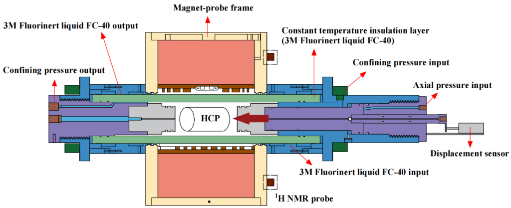 HCP內(nèi)部水分分布的實(shí)時(shí)變化情況,揭示這一過(guò)程將有助于理解HCP體積變形機(jī)制。然而,過(guò)去關(guān)于水分遷移的研究受傳統(tǒng)方法限制,無(wú)法實(shí)時(shí)監(jiān)測(cè)水泥基材料在壓荷載作用下的水分遷移過(guò)程。1H NMR技術(shù)可是一種利用水分子中質(zhì)子的弛豫特性來(lái)測(cè)量?CBM 中水含量和分布的新方法。該技術(shù)能夠?qū)ν粯悠愤M(jìn)行連續(xù)、無(wú)損的檢測(cè),從而準(zhǔn)確測(cè)試CBM在荷載作用下的水分遷移和重分布過(guò)程,是定量研究水分遷移的有力工具。在本研究中,采用1H NMR技術(shù)研究了不同相對(duì)濕度(RH)環(huán)境下?HCP 的水分平衡過(guò)程,并評(píng)估了達(dá)到平衡后的力學(xué)性能。此外,還設(shè)計(jì)了一套具有軸壓控制功能的1H NMR系統(tǒng),用于在不同應(yīng)力水平下原位監(jiān)測(cè)?HCP 加載過(guò)程中的應(yīng)變和水分分布變化。明確了不同類型孔隙水的水分遷移機(jī)制及其對(duì)?HCP 力學(xué)性能的影響,為CBM的變形機(jī)制提供了理論依據(jù)。
