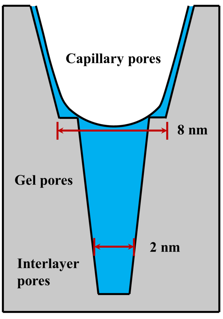 水作為水泥基材料(CBM)的重要組成部分,其在內(nèi)部孔隙中的分布和遷移將對(duì)CBM的性能產(chǎn)生重要影響。根據(jù)硬化水泥漿體(HCP)內(nèi)部孔隙類型,水泥基材料中的水可分為C-S-H層間水、凝膠水、小毛細(xì)孔水和大毛細(xì)孔水,如表1所示。C-S-H層間水和凝膠水共同存在于納米尺度的C-S-H凝膠中,是決定C-S-H凝膠微觀結(jié)構(gòu)的重要因素。干燥過(guò)程中凝膠水和層間水的失去會(huì)導(dǎo)致C-S-H層間距減小,凝膠孔向?qū)娱g孔轉(zhuǎn)變。當(dāng)干燥狀態(tài)下的HCP再濕潤(rùn)時(shí),層間孔將重新恢復(fù)為凝膠孔。此外,C-S-H層間距影響HCP的徐變性能,C-S-H